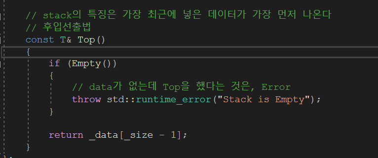 후입선출법을 구현하기 위해서 가장 마지막에 추가된 데이터가 필요하므로 Top() 메서드를 호출하면 마지막 인덱스의 있는 값을 리턴합니다.