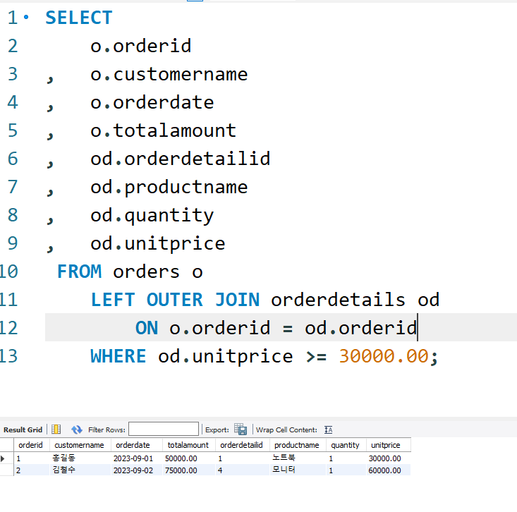 어차피 od.unitprice는 orderdetails에 있는 컬럼입니다. 그렇다면 JOIN을 하기전에 WHERE절을 사용하여 JOIN할 데이터를 줄이는것이 더 좋습니다.