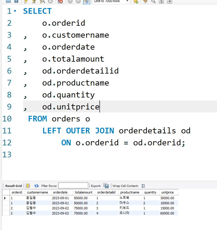 이제 데이터가 삽입 되었으므로 orders와 orderdetails의 테이블을 left outer join을 걸어서 살펴보겠습니다.